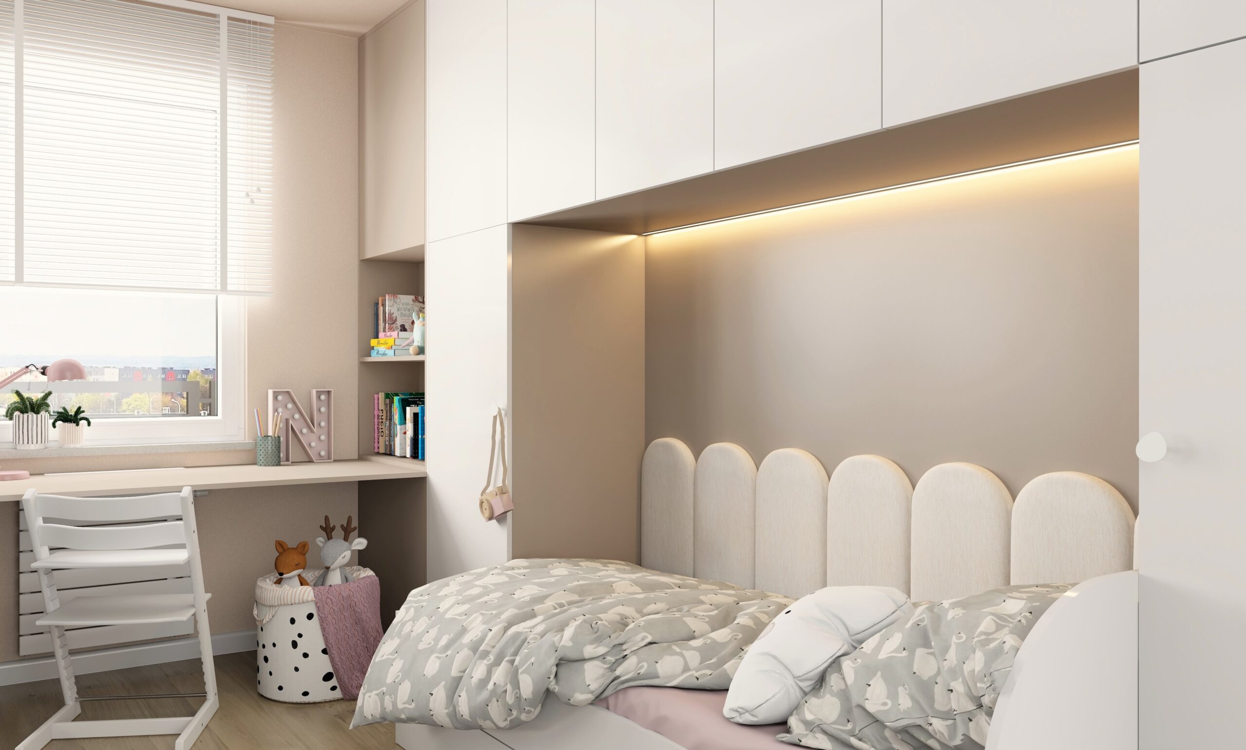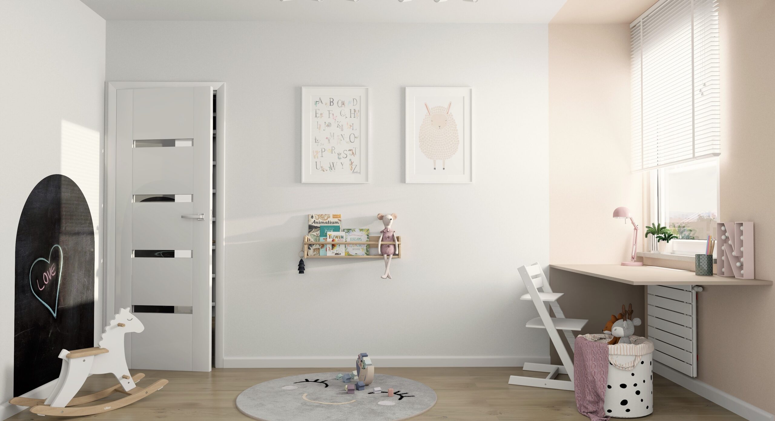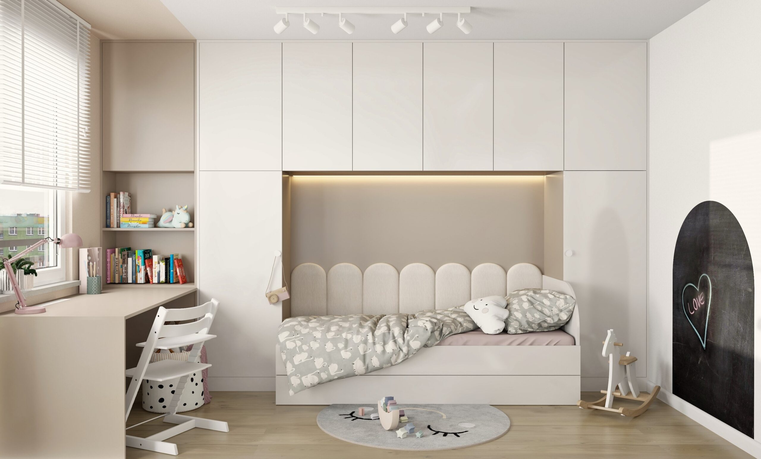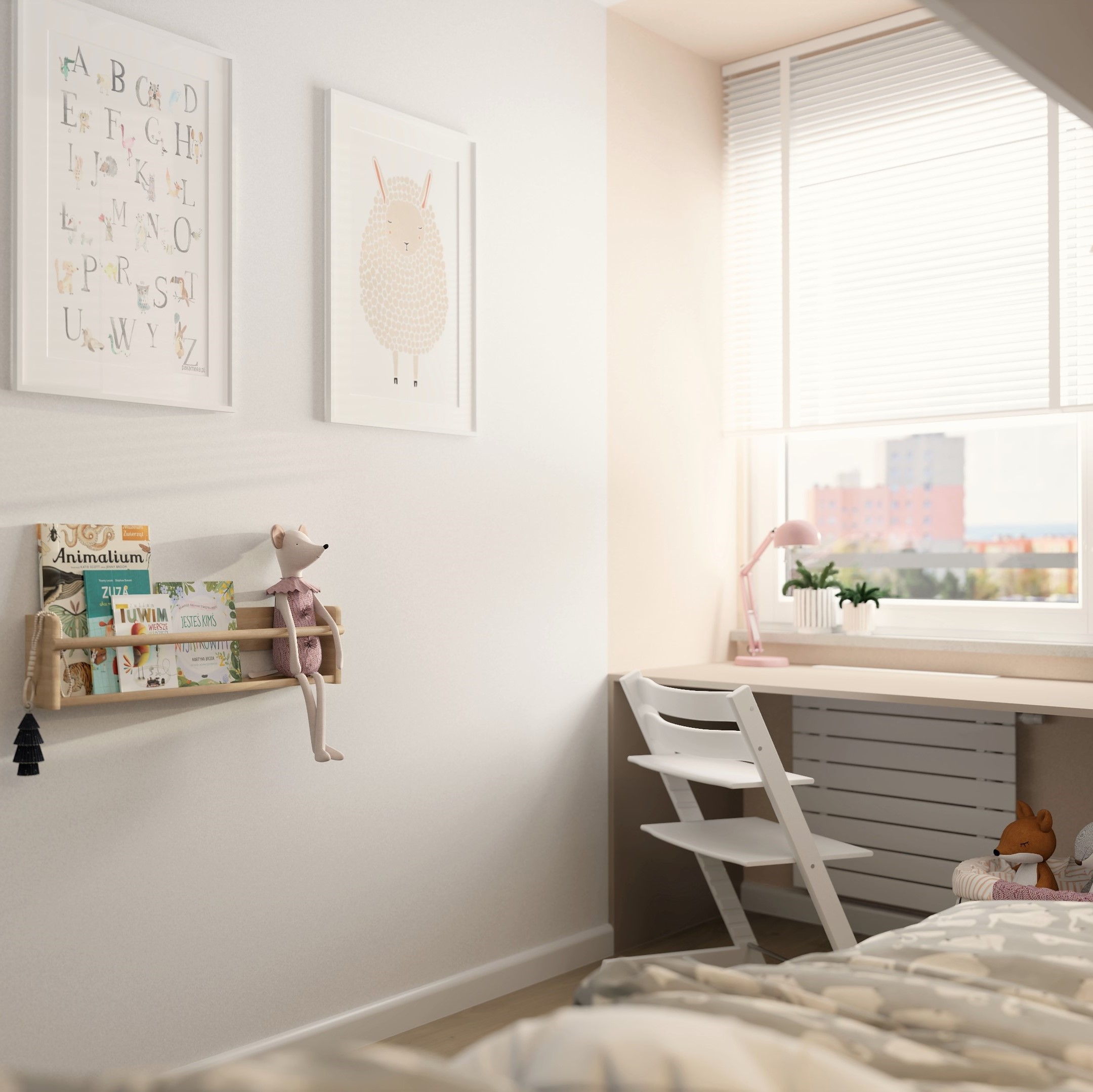👱‍♀️🌸 Pokój trzyletniej dziewczynki, który ma za zadanie rosnąć razem z nią. Zastosowano paletę jasnych, pastelowych kolorów aby stworzyć przytulną dziewczęcą atmosferę.