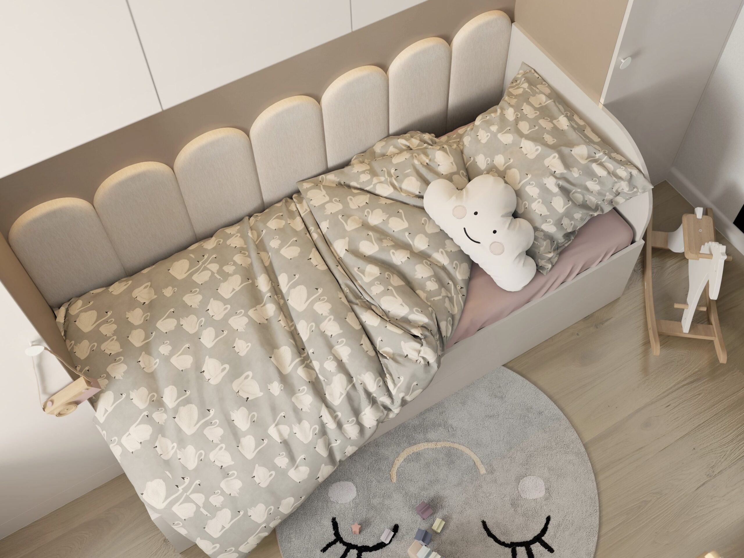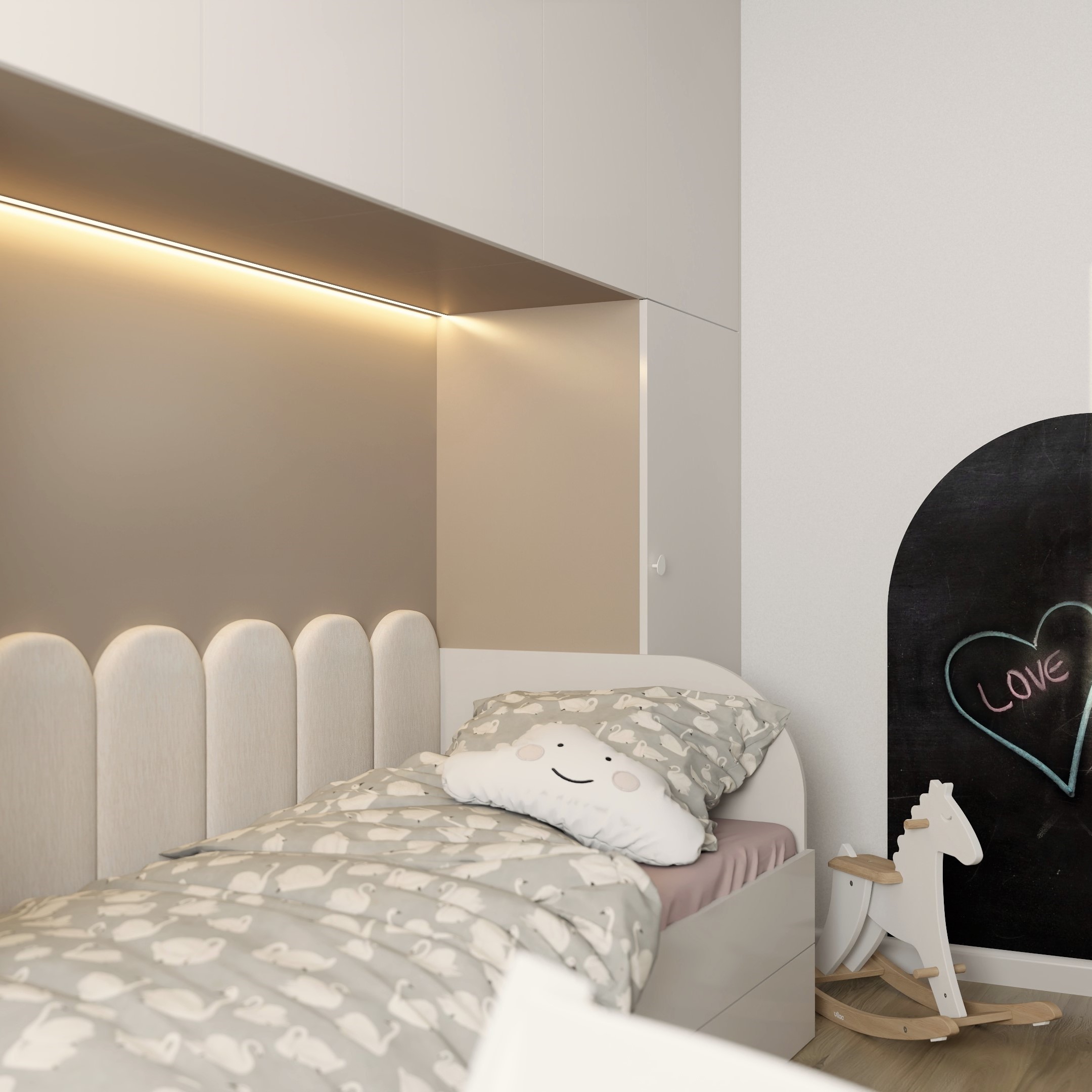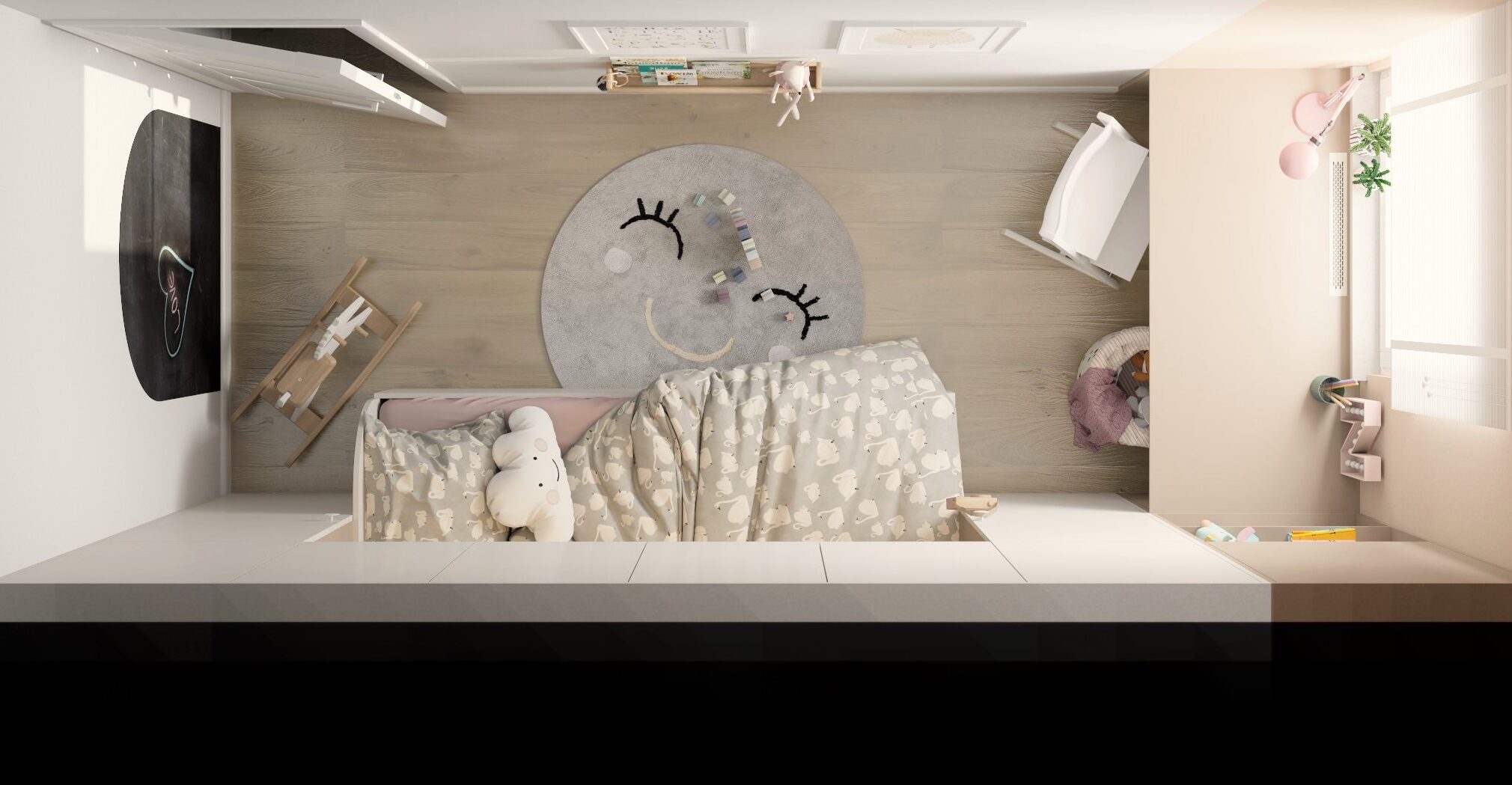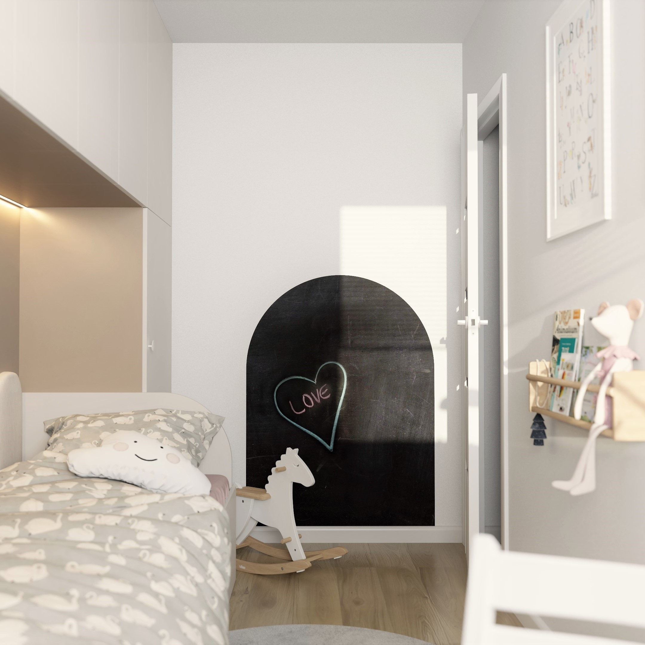 👱‍♀️🌸 Pokój trzyletniej dziewczynki, który ma za zadanie rosnąć razem z nią. Zastosowano paletę jasnych, pastelowych kolorów aby stworzyć przytulną dziewczęcą atmosferę.
